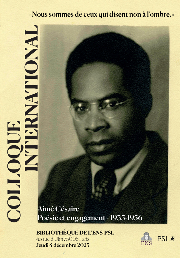 Besides this exhibition, a symposium organised by Jean Khalfa (Trinity College Cambridge), Dominique Combe (École Normale Supérieure), Cecile Gobbo (Chief librarian and co-director of the ENS-PSL libraries), Camille Dorignon (Head of French and English literature collections at the ENS library) will take place at the ENS on the 4th of December, covering Césaire’s writing and political career. The place of women at the avant-garde will be underlined and this event will also be anchored in the present: the poet Nimrod will read passages of his collection Babel Babylone (Obsidiane, 2010, in process), in tribute to Césaire, while students from the Africana-ENS association will give readings of Césaire’s texts at regular intervals.
