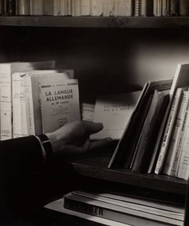The exhibition copy of the 1942 edition is inscribed and dedicated by Vercors to Gilberte Chapuis, who as a young girl cycled round Paris distributing copies of the novella. The University Library’s copy of this edition is a later printing, which stands at 1994.7.597. Also displayed is a 1944 photograph by Pierre Jahan showing Le silence de la mer concealed behind another row of books in his apartment. On the back of the picture he writes