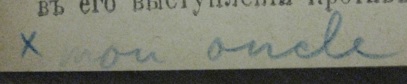 It is satisfying to sort such errors out and always enjoyable to take the opportunity to look more closely at this kind of material. Pronin’s Kornilov book focuses on its subject’s military career. After service in the Imperial Russian Army, Kornilov was placed at the head of the Provisional Government’s army following the 1917 February Revolution. He led an attempted coup, was imprisoned but escaped, and then joined and took command of the Volunteer Army in the south. Our copy of the book reached the UL in 1975, transferred from the University’s Slavonic Library, a fine collection which was later brought into the Modern and Medieval Languages Faculty Library. The book’s text is liberally covered with underlinings, largely in blue pencil. On page 31, there is a surprise. In a section about the coup, a list is given of the names of those who supported Kornilov and shared his imprisonment. The blue pencil marks one out with an asterisk which leads to a note in French: “mon oncle”.