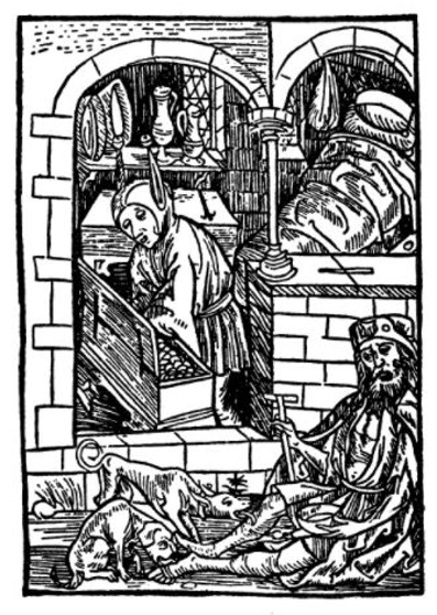 Next we have the wealthy fool, appearing to value money more than wisdom as he counts his coins while a poor beggar sits in the foreground. Zeydel’s translation of the introductory text above the woodcut sums it up well: