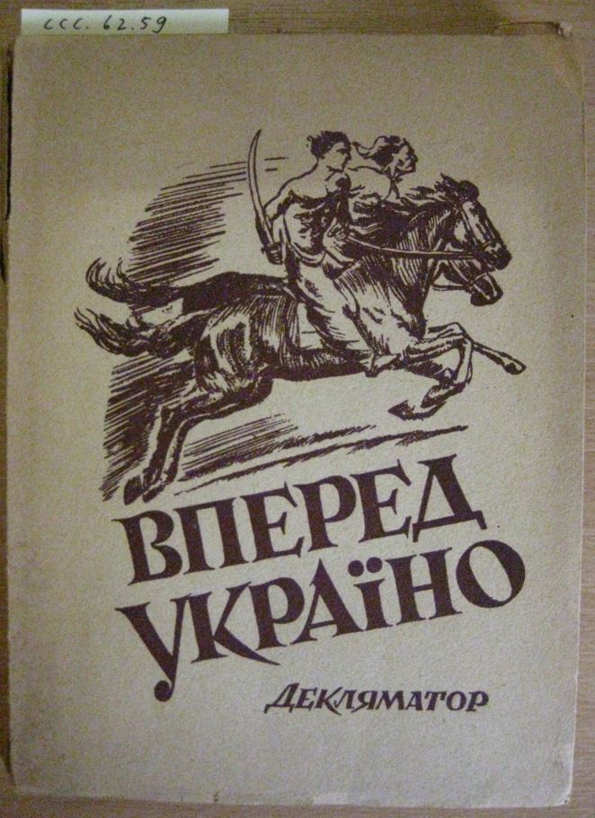 Vpered, Ukraïno! (note the vocative form of the country name) was published in Paris by the group Ukrainian National Unity in France, in their Library of Self-Enlightenment, and describes itself in its sub-title as a narodnyĭ deklamator, a folk reciter.