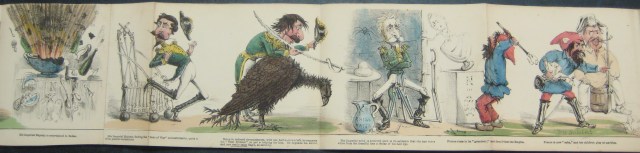 The work is original because it combines ingeniously the form of the panorama with the genre of satire. It features caricatures of famous individuals (Wilhelm I, Bismark, Napoleon III, Moltke, McMahon, prince Eugène-Louis Napoléon, Bazaine, Victor Hugo…), as well as more generic satirised figures (French (colonial) troops, French Republicans / revolutionaries…). Cruikshank’s Panorama is more than a single-page sum of individual caricatures or comic strip, and differs from a large satirical group portrait such as the Panthéon Nadar (1851). It develops as a sequential comic strip in an accordion fold-out. Cruikshank had previously created other folded lithographic comic panoramas inspired by contemporary history: he illustrated ‘Guy Faux: a Squib’ by Horace Mayhew (1849), and authored ‘The Comic History of the Russian War’ [c.1856], and ‘The Comic History of the Potentates of the World’ [n.d.].
