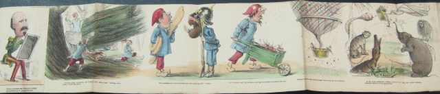 The Panorama of the Franco-Prussian war, published in London by F. Platts & Mann Nephews, was “painted by PC from the sketches of Messrs. Smith, Brown, Jones & Robinson”. The full signature of Percy Cruikshank (1817-1880) appears repeatedly within the images themselves. Percy came from an illustrious family of caricaturists: he was the son of Isaac Robert Cruikshank (1789-1856), the nephew of George Cruikshank (1792-1878), and the grandson of Isaac Cruikshank (1764-1811). He contributed caricatures of the Franco-Prussian war to the British satirical humour magazine Judy or the London Serio-Comic Journal (named after Punch and Judy). The highly collaborative nature of the panorama is interesting given the reference to no less than four sketchers.