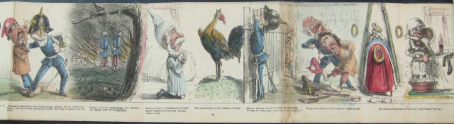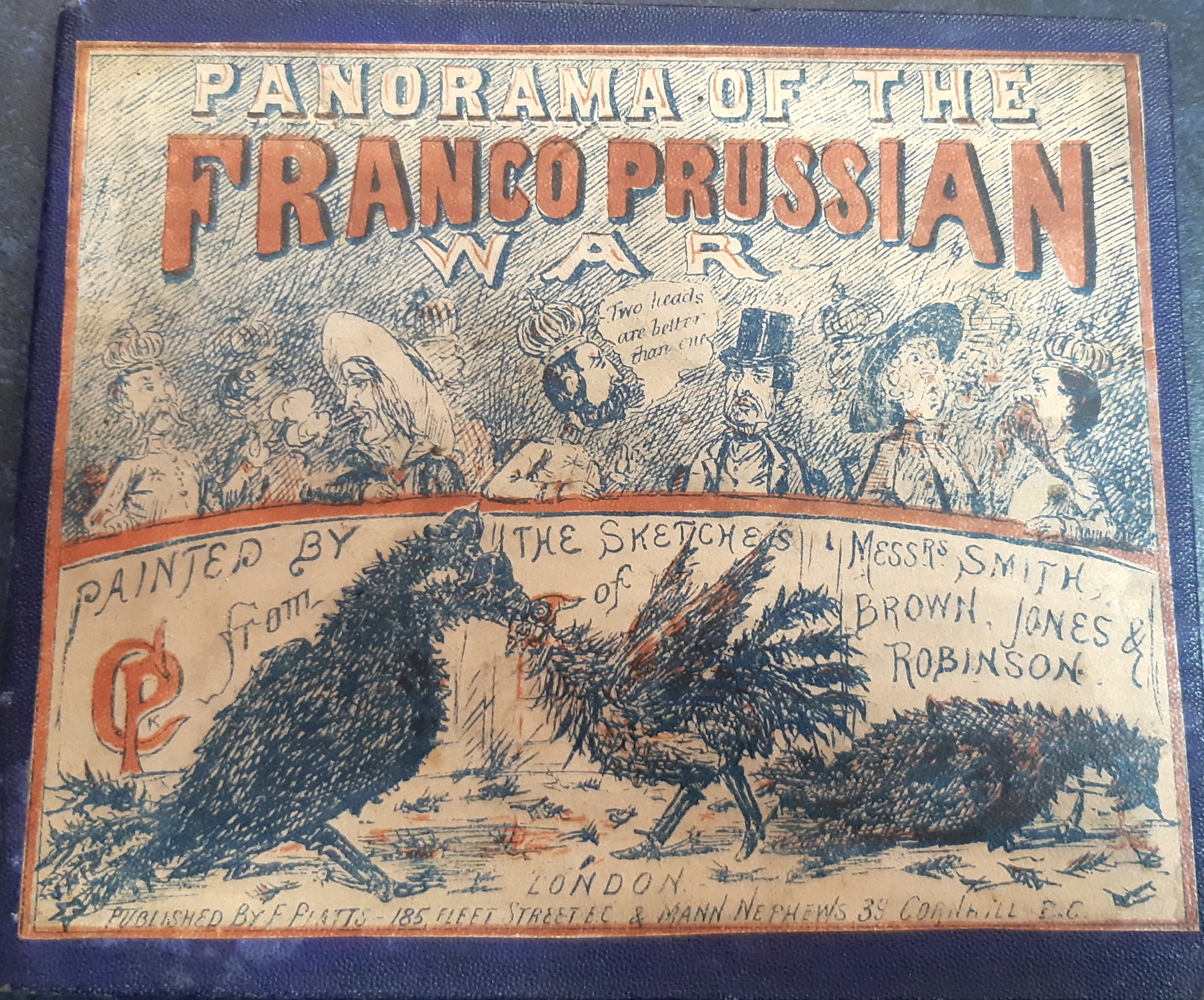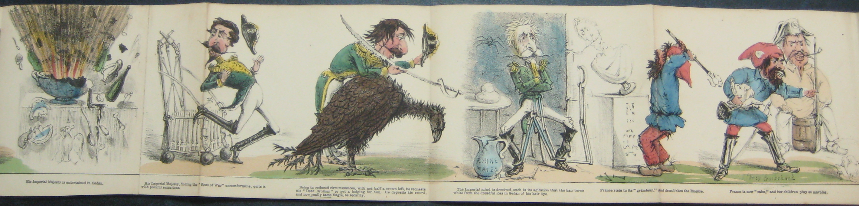 We are delighted to be able to shed light on the recent purchase by Cambridge University Library Special Collections of a satirical Panorama of the Franco-Prussian war. Illustrated by Percy Cruikshank, it probably dates from the end of 1870. It relates to both the exhibition of the Cambridge collection of 1870-71 caricatures held at the University Library this spring, and the academic conference on the Memory of 1870-71 held at Wolfson College by Marion Glaumaud-Carbonnier and Nick White last month.