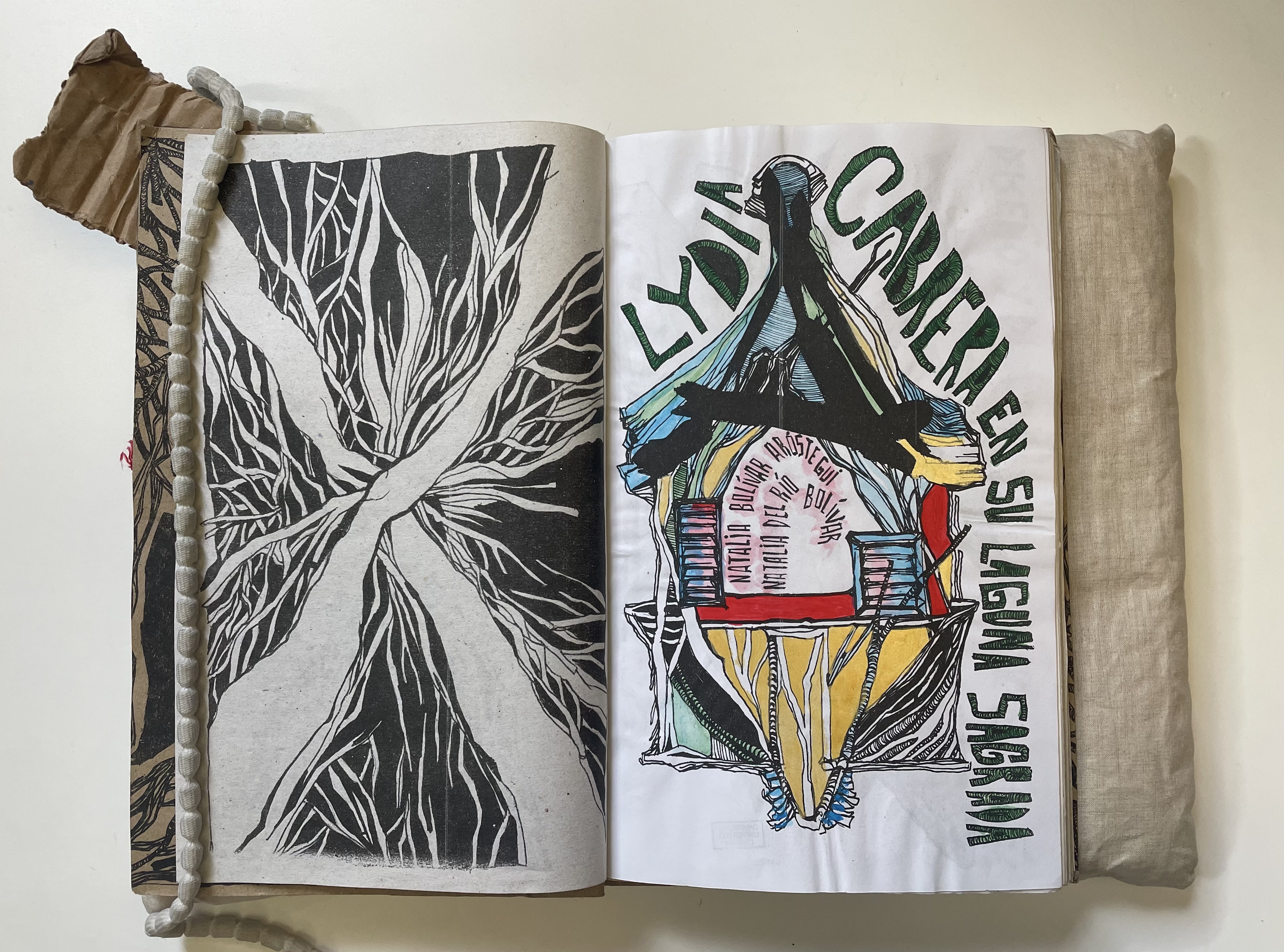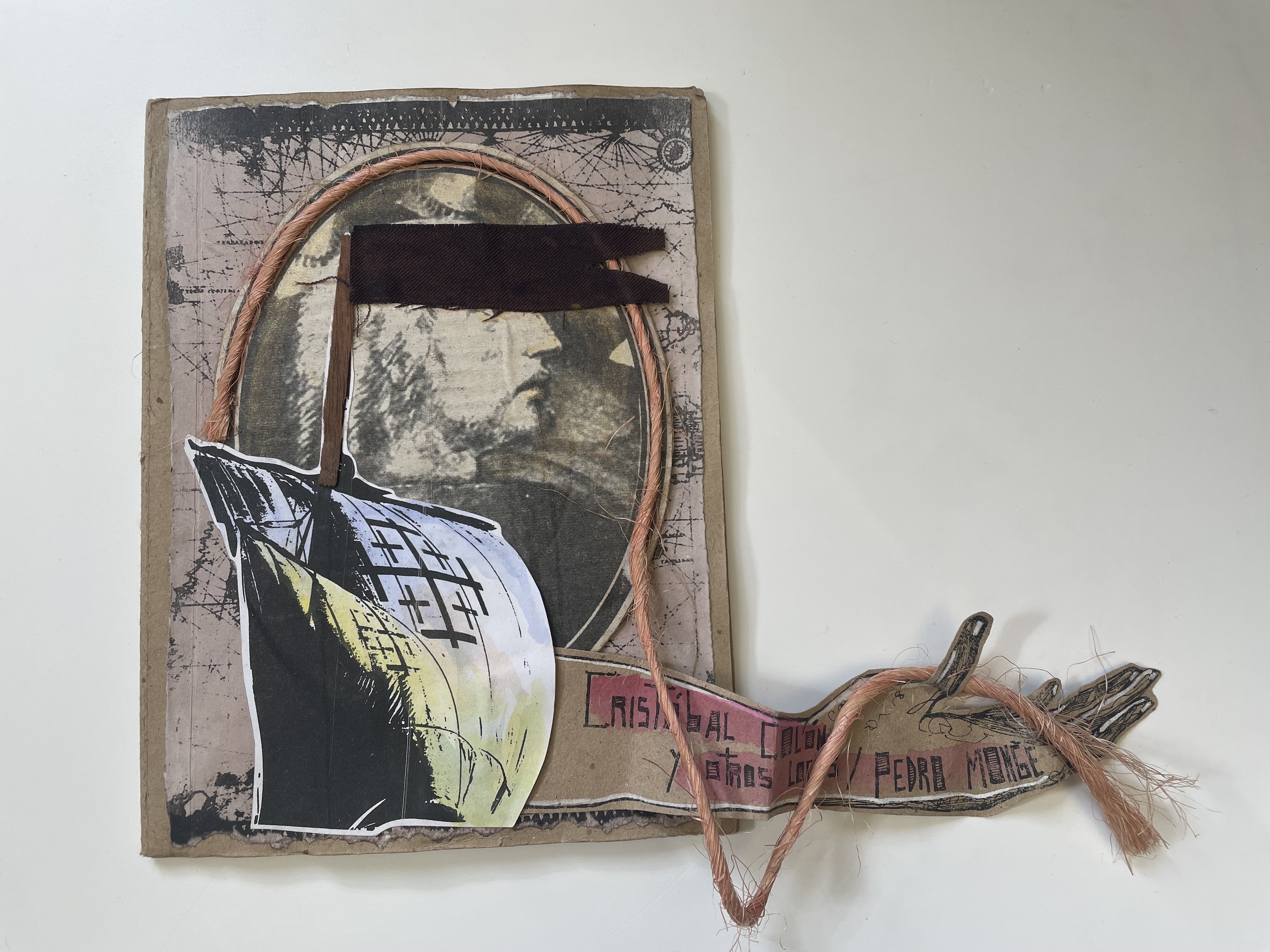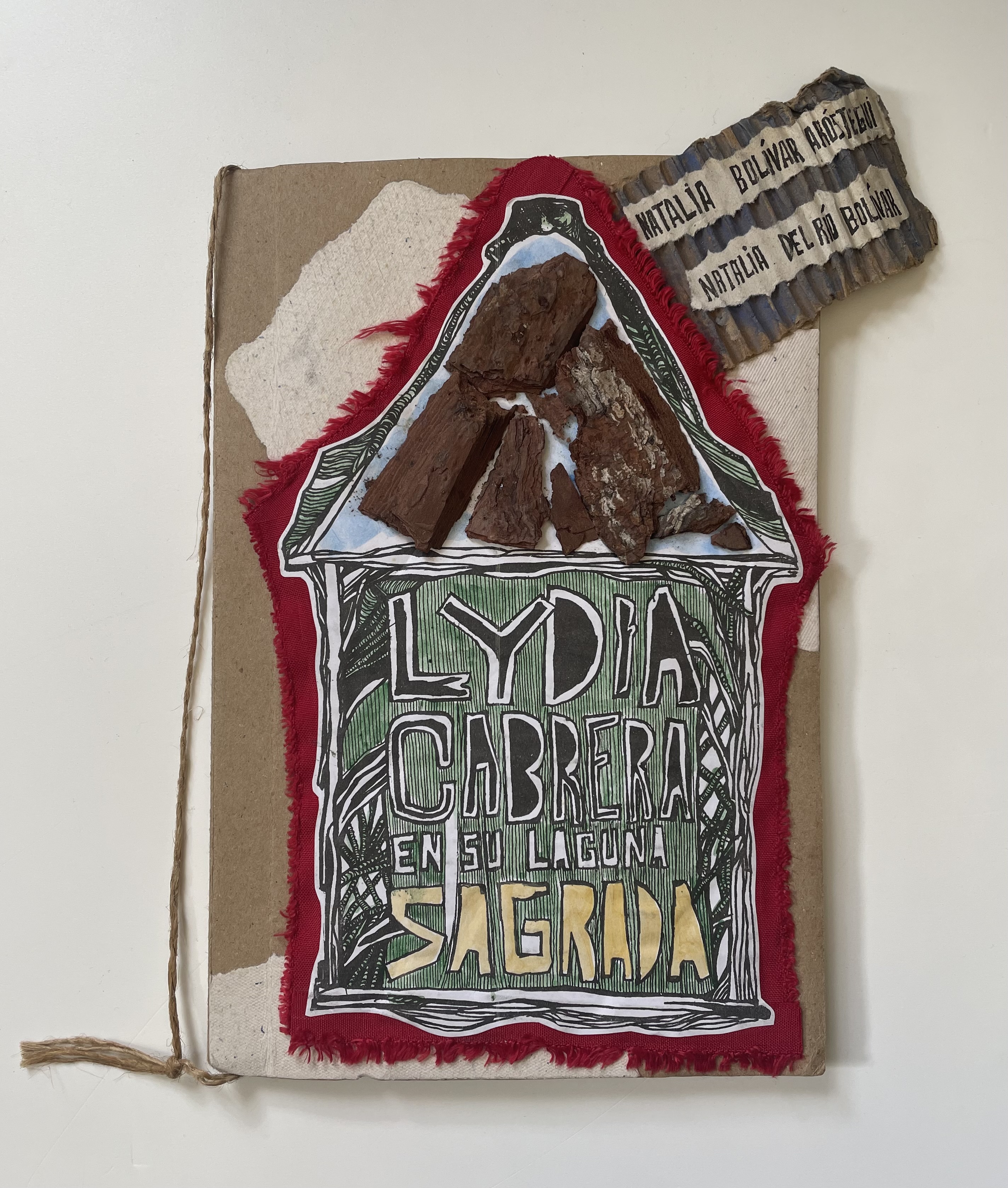 Lydia Cabrera en su laguna sagrada, by Natalia Bolívar Arostegui (2015). A rich collage made of bark chippings, cloth, cardboard, jute cord and hand-coloured paper cut-outs.
