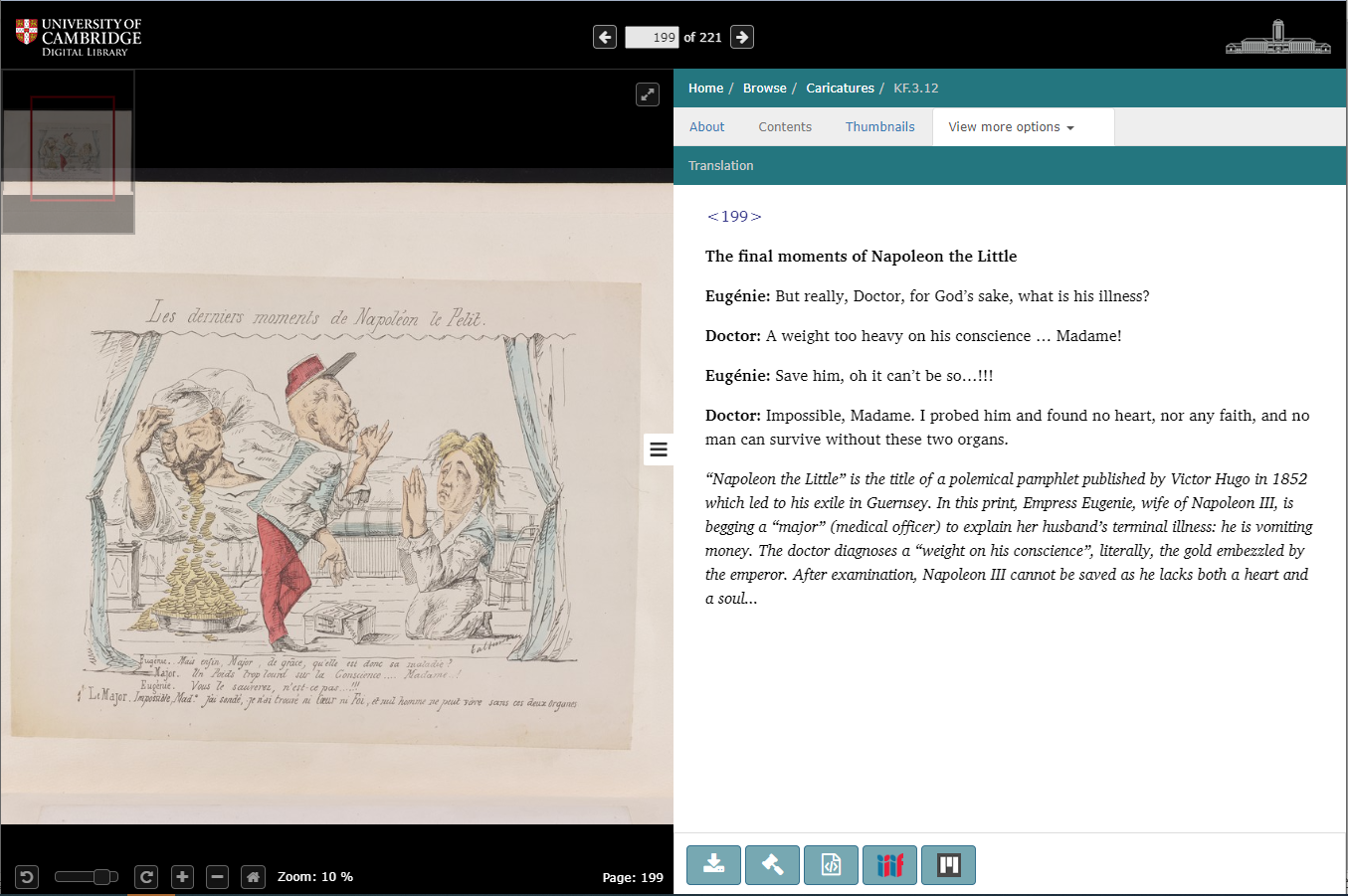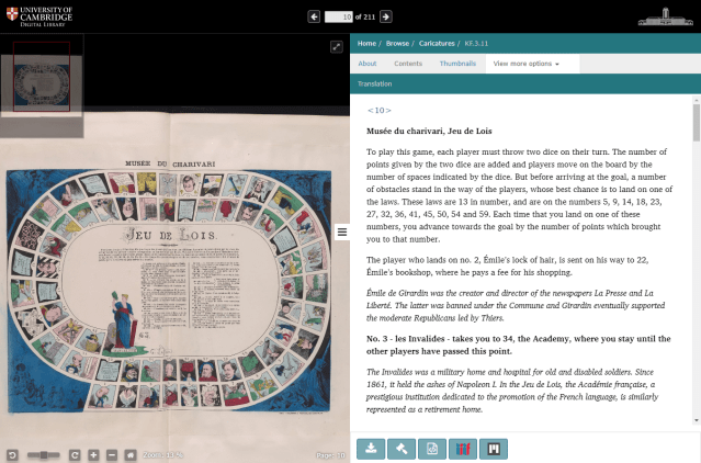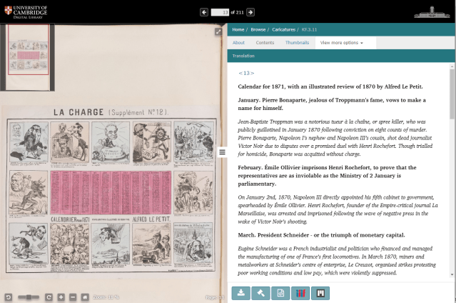 The project led us to use TEI (which stands for Text Encoding Initiative), a code or standard used for the representation of texts in digital form. This allowed us to format the text intended to be published in Cambridge University Digital Library. Translations and commentaries thus enrich some of the metadata of the caricatures which feature on the Digital Library. You can find them by looking at a specific caricature and selecting the tab “View more options > Translations”.