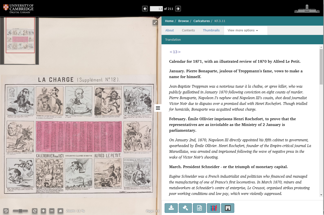 The caricatures range from the Franco-Prussian war and the first siege of Paris (in the Summer and Autumn of 1870) to the armistice, the Paris Commune, and its defeat by the Versailles-based Republican forces (in the Spring of 1871). Working on the translations showed the necessity for a commentary of the prints. The caricatures referred to events of the time which needed some historical background to be understood by the contemporary viewer. It was equally important to be able to identify the characters and situations portrayed in a satirical manner.