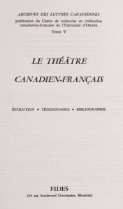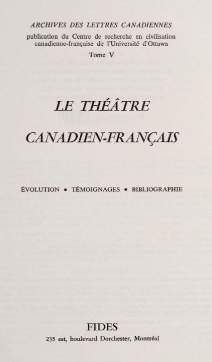 - Burger, Baudouin. ‘Les Spectacles dramatiques en Nouvelle France (1606–1760)’. In Le Théâtre canadien-français : Évolution, témoignages, bibliographie, edited by Paul Wyczynski, Bernard Julien, and Hélène Beauchamp-Rank, 33–57. Montréal: Fides, 1976. (737:14.c.95.9 and Internet Archive)