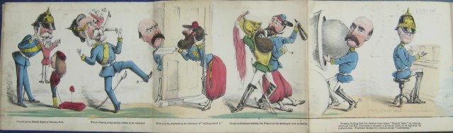 Two years ago, Cambridge University Library acquired a satirical pocket-size (but 3 meters long, once unfolded) Panorama of the Franco-Prussian war by Percy Cruikshank (1870) (8000.e.354). This work is a good complement to the library’s Collection of 1870-71 Franco-Prussian caricatures from a British perspective. In a talk taking place on Thursday 7 March from 5-6pm in the University Library’s Milstein room, as part of the Cambridge History of Material Texts seminar, we are going to present Cruikshank’s panorama and contextualise this work within the author’s creation of other comic cartoons produced in the concertina format.