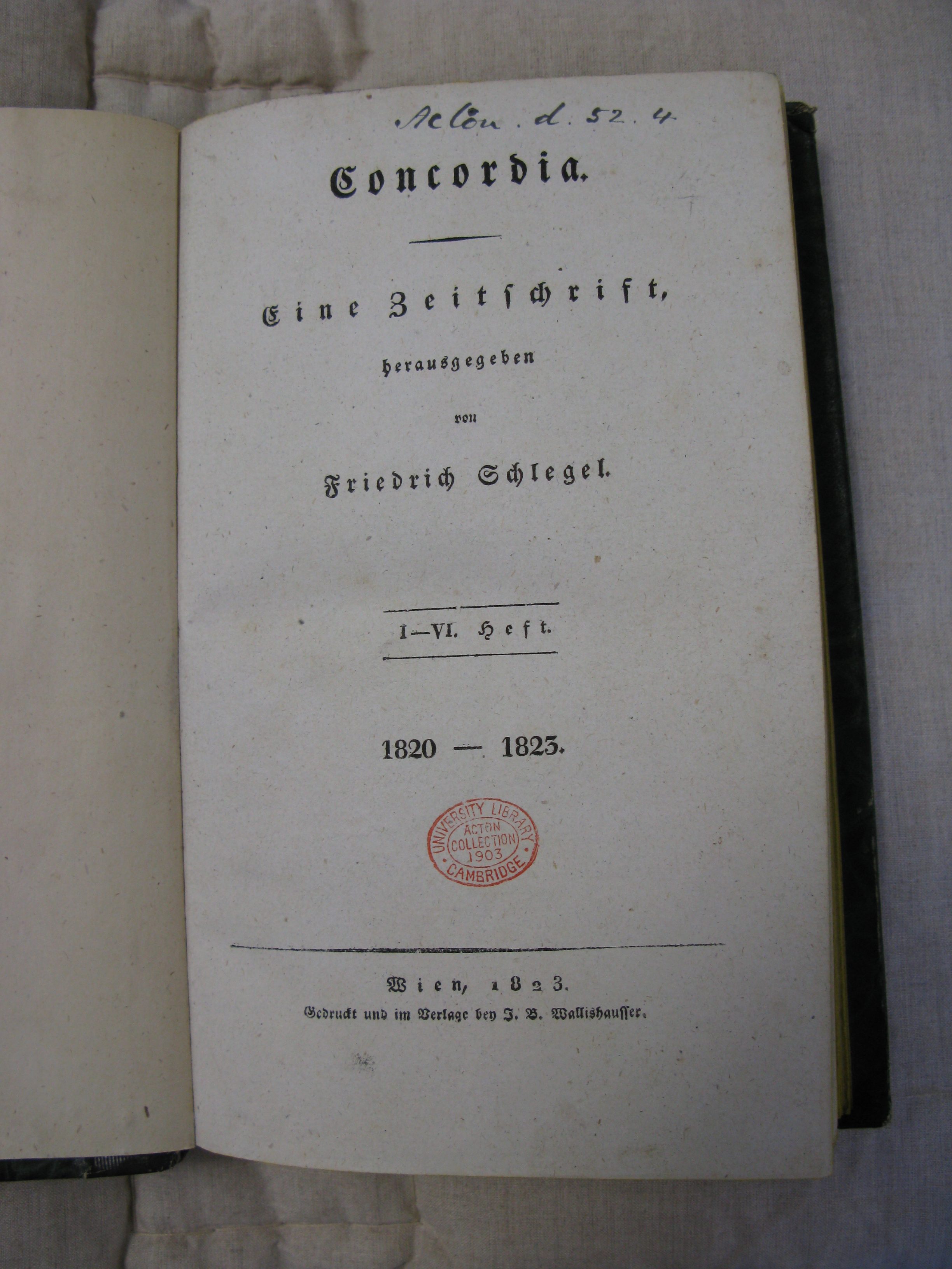 Anyone interested in Schlegel’s life and work will find abundant material at the University Library; over 200 titles are listed in our online catalogue with Friedrich Schlegel as either author or subject. Our holdings of original editions of Schlegel’s writings are sadly not comprehensive; however, we hold several works he published in the later part of his life. We are particularly proud to have the set of volumes collecting his philosophical lectures, namely: Philosophie des LebensHh.39.31 (lectures held in 1827, published in 1828), Philosophie der GeschichteHh.39.27-28 (lectures held in 1828, published in 1829) and Philosophische Vorlesungen, insbesondere über Philosophie der Sprache und des WortesHh.39.26 (lectures held in December 1828/January 1829, published in 1830).
