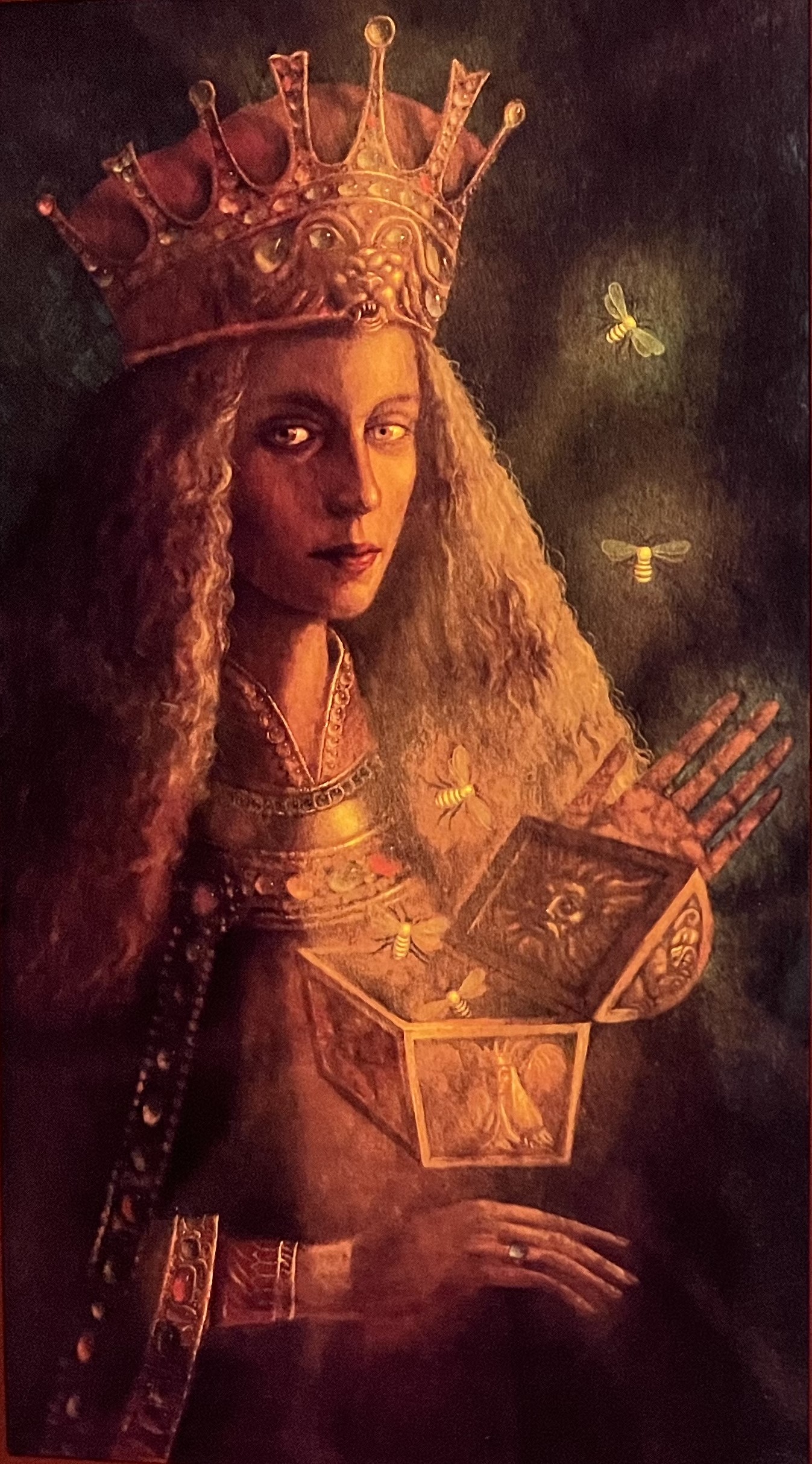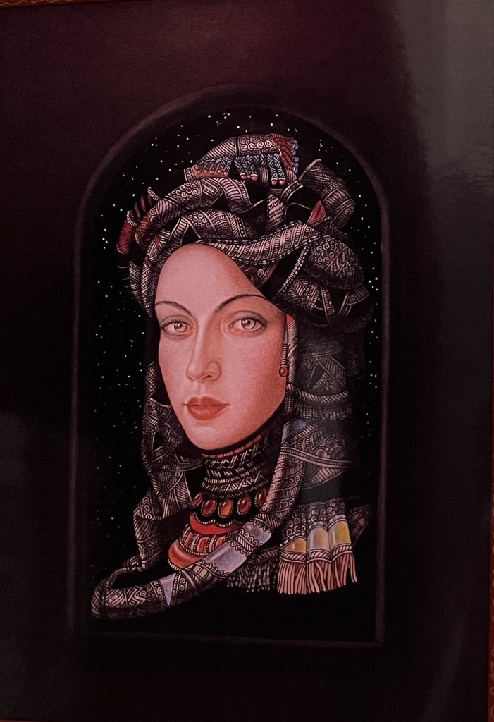 This particular edition of Twenty love poems and ‘A song of despair’ was printed by Ismael Espinosa in 1990 in Santiago de Chile.[i] It is presented in elephant folio, with a satin ribbon, illustrated with eight original glazes by Chilean magical realism painter Hernán Valdovinos. The volume is beautifully bound in peacock-feather decorated cloth, with gold paper-title-label insert on the front panel and marbled endpapers.[ii] The calligraphy is by María Angélica Seguel.