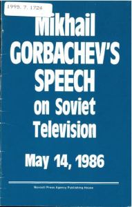 The fears about the Zaporizhzhia nuclear station, currently occupied by Russian forces. are of course particularly troubling in the context of the nuclear disaster in Ukraine 36 years ago. The item shown here, Mikhail Gorbachev’s speech on Soviet television, May 14, 1986, contains the translated text of the speech he made in the light of the appalling accident that had occurred on 26 April at Chornobyl’ (Ukrainian; Chernobyl’ in Russian). The 14 May speech was the first full statement by the Soviet leader about what had happened weeks before. Continue reading “Ukraine, Gorbachev, and nuclear power”
